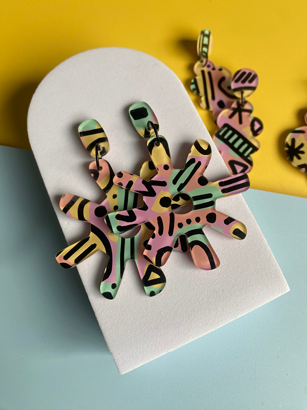 With a background in graphic design, Sarah started experimenting with ceramics but soon realised the challenges of working with that medium alongside parenting. She switched to polymer clay earrings, which quickly evolved into her signature hand-painted pieces – each uniquely crafted to spark joy and start conversations.