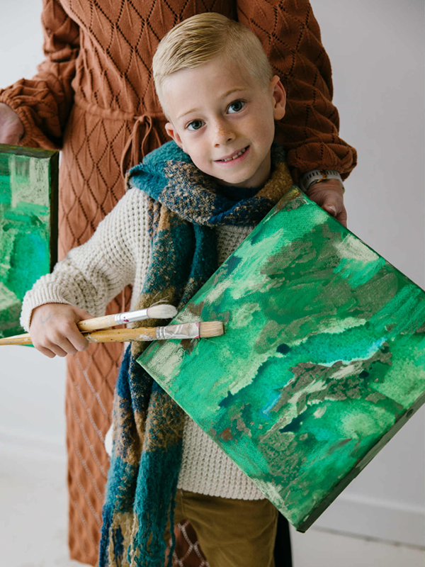Right now, Mel is pouring her heart into one of her most joyful and personal projects yet: a joint exhibition with her 7-year-old son. Titled UNSTRUCTURED: Through Our Eyes, Connected in Colour, the show opens September 6 & 7 at The Owens Collective and celebrates creative freedom and the beautiful mess of self-expression. The works – created side-by-side – are bold, playful and deeply personal.